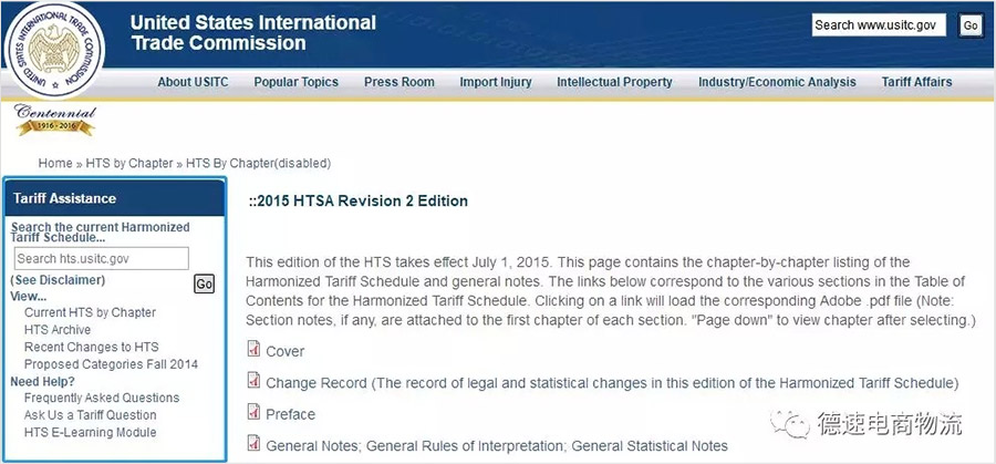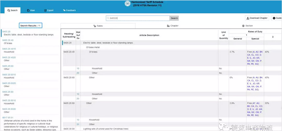 點擊“美國海關關稅查詢”官方網址:http://www.usitc.gov/tata/hts/bychapter/index.htm,在Tariff Assistance項下Search the current Harmonized Tariff Schedule...下的搜索框中輸入輸入中國HS CODE的前六位數,如臺燈940520****,搜索結果頁面的左邊框有詳細的HTS CODE,根據自己的產品選擇HTS CODE。