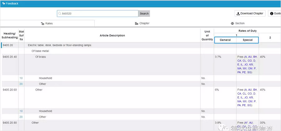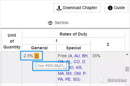 搜索頁面中Rates of Duty 1左邊一欄“General”為一般進口稅率,右邊一欄“Special”是美國對特定國家征收的進口稅率。