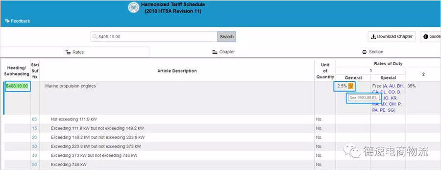 小德舉個栗子給大家說明一下:我們以稅號為“8408.10.00”的船用推進發動機為例演示,這項產品被列入了160億美元的加稅清單中,此前它的進口稅率在“General”處顯示是2.5%。但它后面跟著一個“1”,顯示讓我們再去查看“9903.88.01”這個副標題。